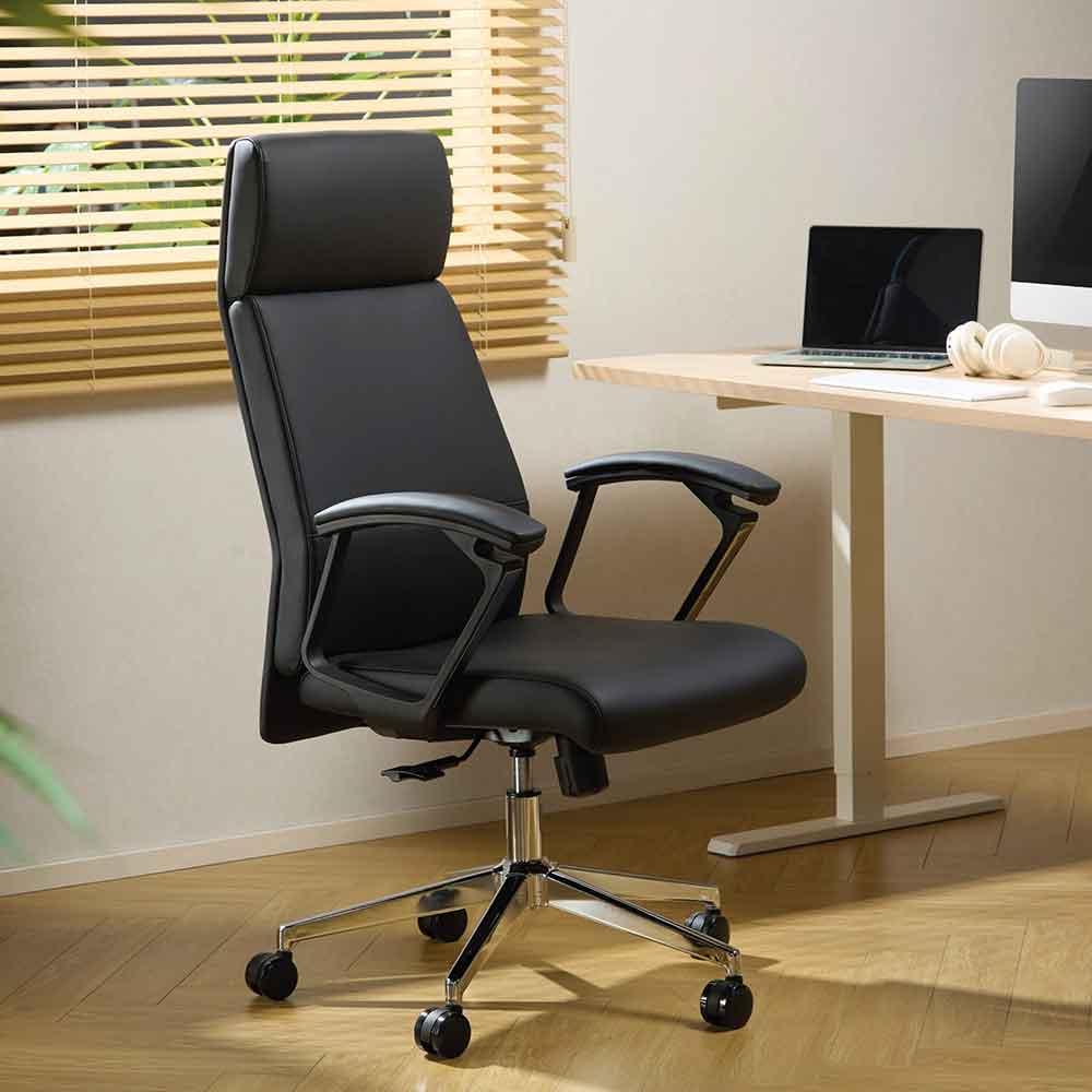Elevate your workspace comfort and style with the Alpine Faux Leather High-Backed Home and Office Chair by Furniture in Fashion. Designed for both home offices and corporate settings, this executive-style chair blends a modern, sleek appearance with ergonomic support, making it an ideal seating solution for long hours of work, video calls, or focused tasks. With its generous high-back design, built-in headrest and smooth mobility, this chair offers a premium seating experience that enhances productivity and maintains posture. Whether youre outfitting a professional office or a home study, this chair provides the comfort, adjustability, and refinement you need. FEATURES : Material : Faux Leather Finish : Black The contoured, extended high back supports your upper back and neck, helping reduce strain during prolonged sitting sessions Crafted with smooth faux leather, the chair offers a polished, professional look and a comfortable seating surface thats easy to clean and maintain Upholstered armrests give you stable support for your arms, useful during typing, meetings, or reading The chair rotates fully and glides across floors easily, allowing you to reach across desks or move around your workspace with ease Easily adjust the seat height to match your desk or sitting posture for customised comfort Recline or rock the chair for comfort, then lock it in place when needed, ideal for breaks or focused work Built on a durable die-cast base that ensures stability, while the large castors provide smooth mobility over office floors Offers ample support and seat space while remaining stable and robust for daily use Its professional design suits corporate offices, home workspaces, studios, or study rooms, a flexible seating solution that fits varied environments The high back, padded arms, and faux leather finish make it a chair that not only feels good but also looks good in any modern interior Available at an affordable price Images shown are fo
