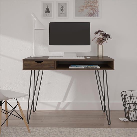 Introducing the Furniture in Fashion Catoosa Wooden Laptop Desk, a sleek and sophisticated addition to your home office or study space. Designed to provide a perfect blend of functionality and style, this desk boasts a rich walnut finish that complements both modern and traditional interiors. The Catoosa desk is compact yet practical, making it ideal for those who seek to maximize their workspace without compromising on aesthetics. Crafted from high-quality materials, this desk features a spacious table top for your laptop, books, or documents, and a convenient single drawer for essential storage. Its minimalist design and elegant wooden grain pattern make it a versatile piece that will elevate the look of any room. Whether youre working from home or managing personal projects, the Catoosa Wooden Laptop Desk by Furniture in Fashion is designed to keep your workspace organized and your productivity high. Enhance your workspace with the Furniture in Fashion Catoosa Wooden Laptop Desk, where timeless style meets modern functionality. FEATURES : Material : Wooden Finish : Walnut Sleek Walnut Finish : Rich walnut veneer enhances the desks classic appeal, adding a touch of warmth to your home office Compact Design : Perfect for small spaces, this desk provides ample surface area without occupying too much floor space Sturdy Construction : Built from premium quality wood, ensuring long-lasting durability and stability Single Storage Drawer : Features one spacious drawer to keep stationery, notepads, and other essentials neatly stored Versatile Use : Ideal for use as a laptop desk, writing table, or a study desk for students and professionals Elegant Wooden Grain Pattern : Showcases the natural beauty of the wood grain, making each desk unique Easy to Assemble : Comes with clear instructions and all necessary hardware for hassle-free assembly Available at an affordable price Images shown are for illustration purpose only DIMENSIONS : Height : 781mm